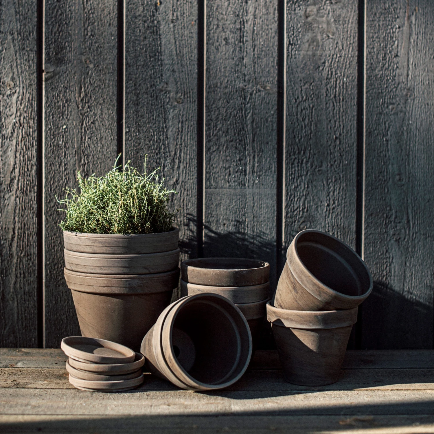 | Stilvoller grauer Terrakottatopf mit smartem Abflussloch am Boden. Der Topf ist handgefertigt, frostbeständig und hat einen passenden Untersetzer (Art. Nr. 401511). Der Topf ist in zwei Größen erhältlich. |