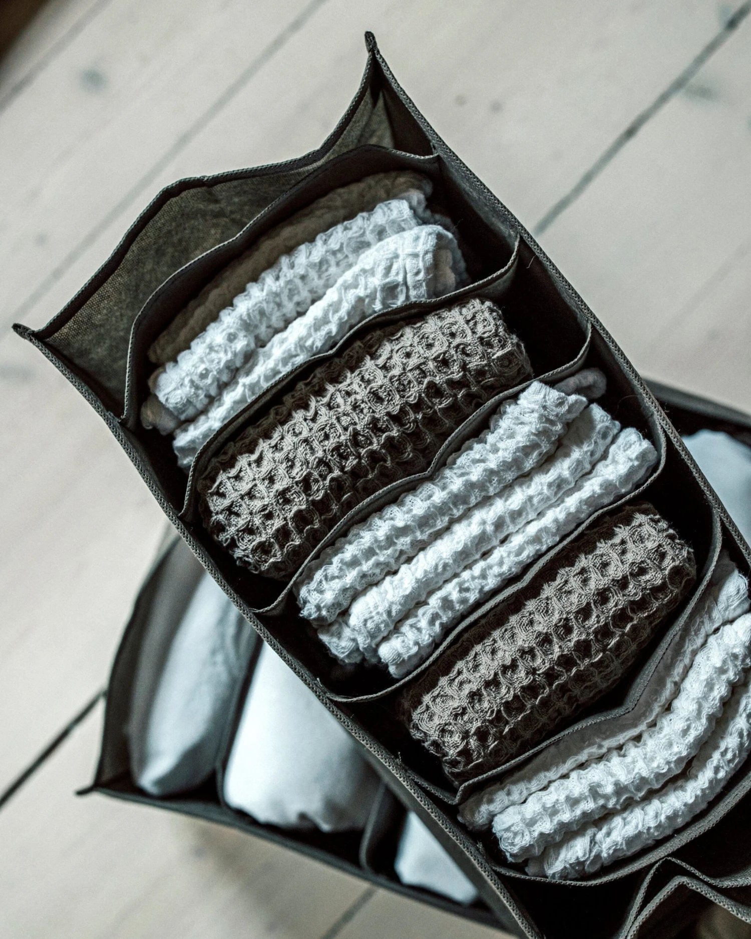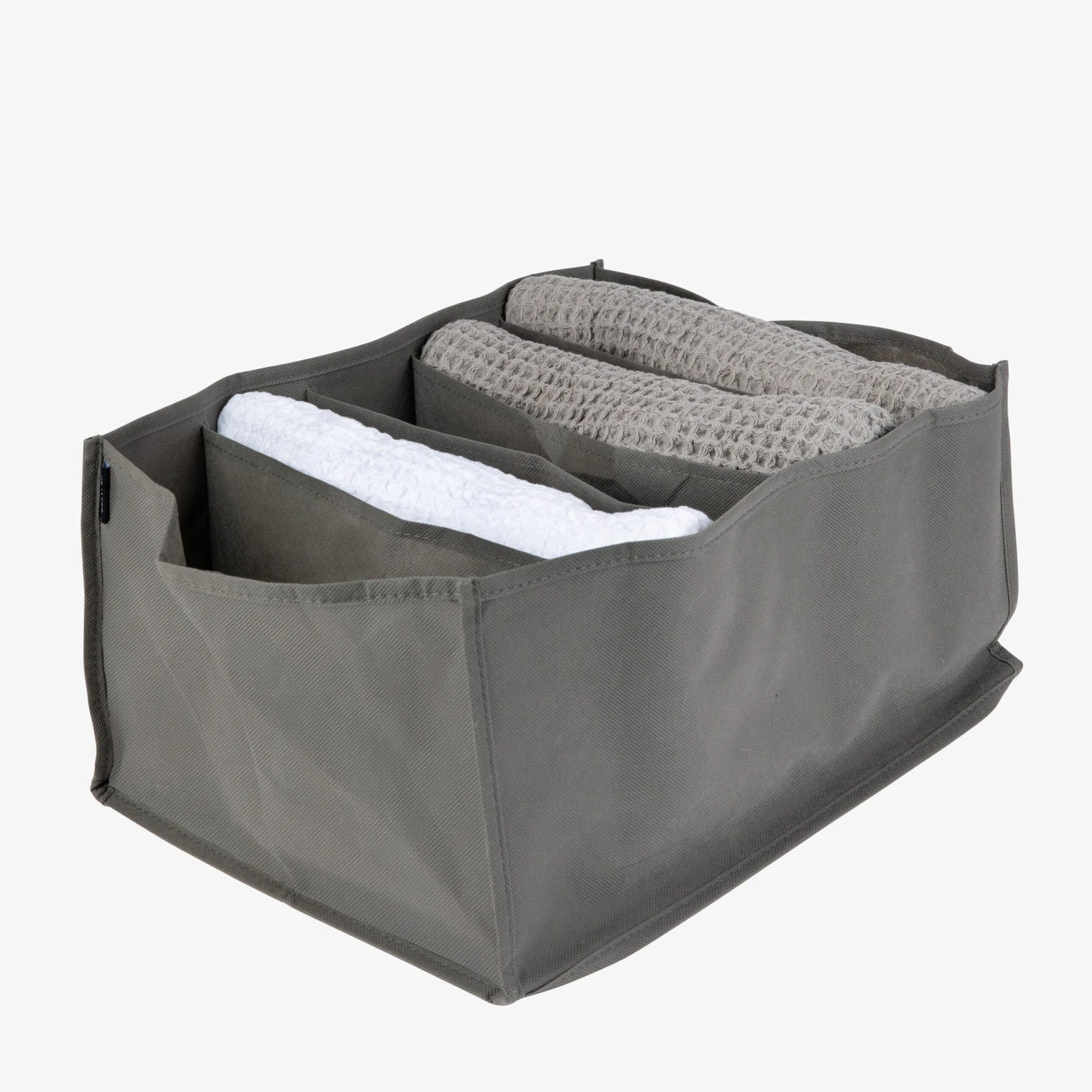 Smarte faltbare Aufbewahrungsbox mit 5 verschiedenen Fächern aus 100 % recyceltem PET. In den Fächern kannst du zum Beispiel Handtücher oder andere Dinge aufbewahren, die du ordentlich verstauen möchtest. Auch in einer kleineren Ausführung mit mehr Fächern erhältlich.