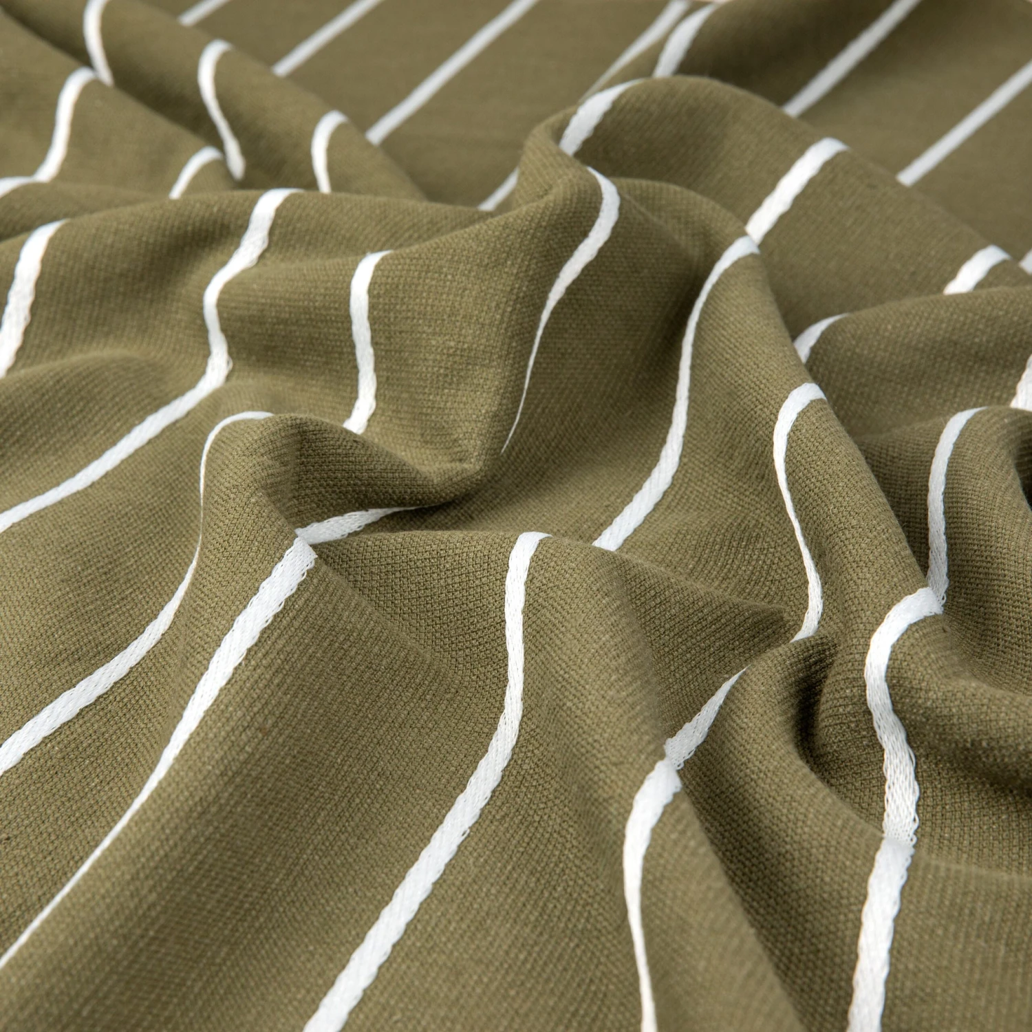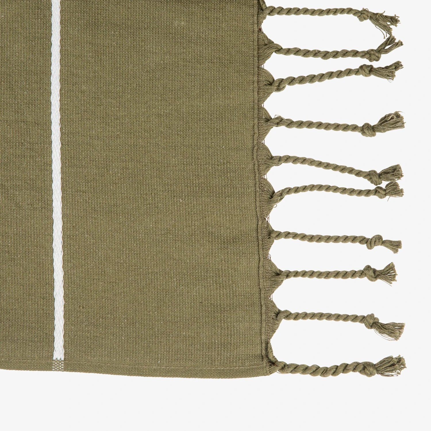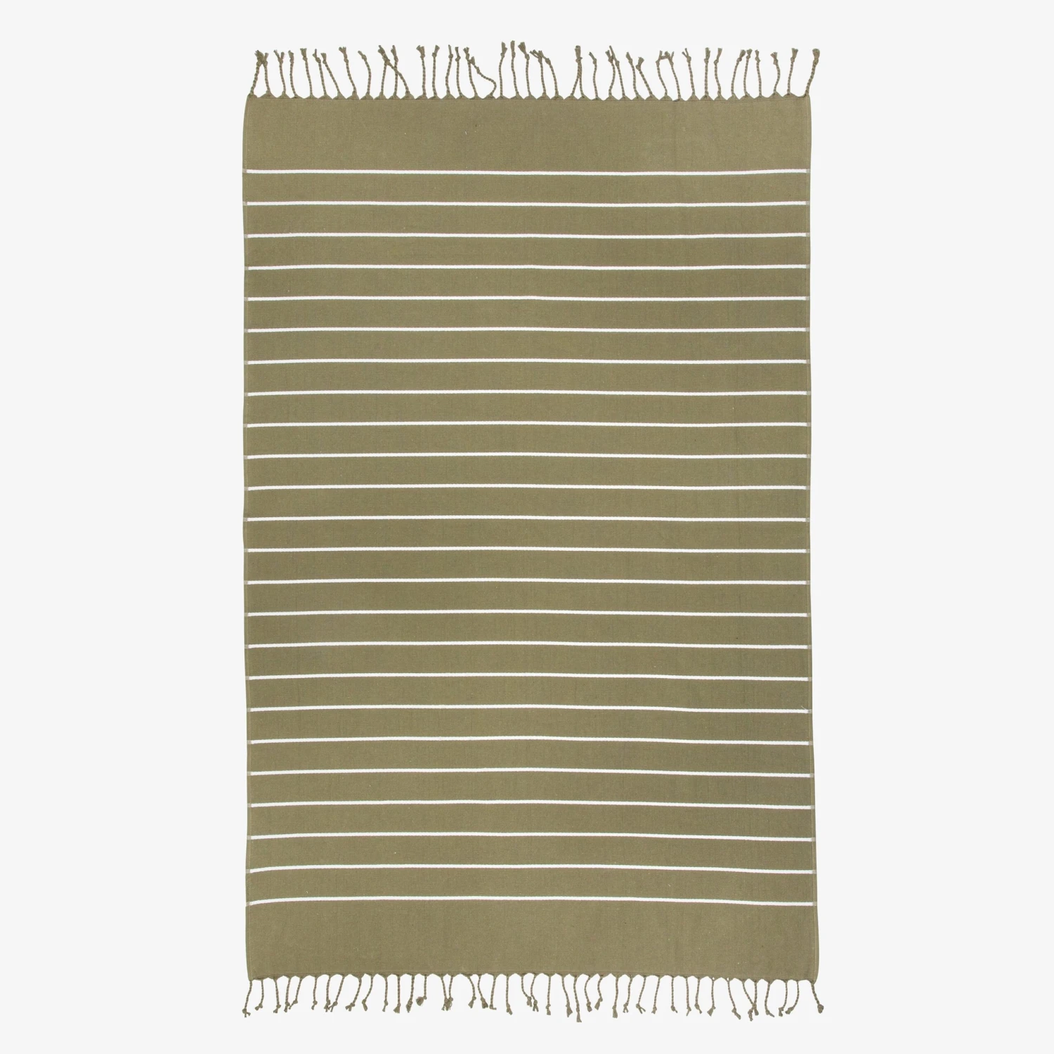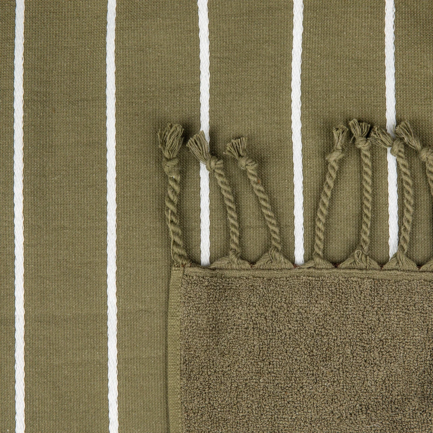Ein kuscheliges Handtuch in dunklem Khaki-Grün mit einer Frottee-Rückseite, die Wasser besonders gut aufnimmt, ideal für Picknick und Strand. Hergestellt aus 100% Baumwolle und Oeko-Tex-zertifiziert.