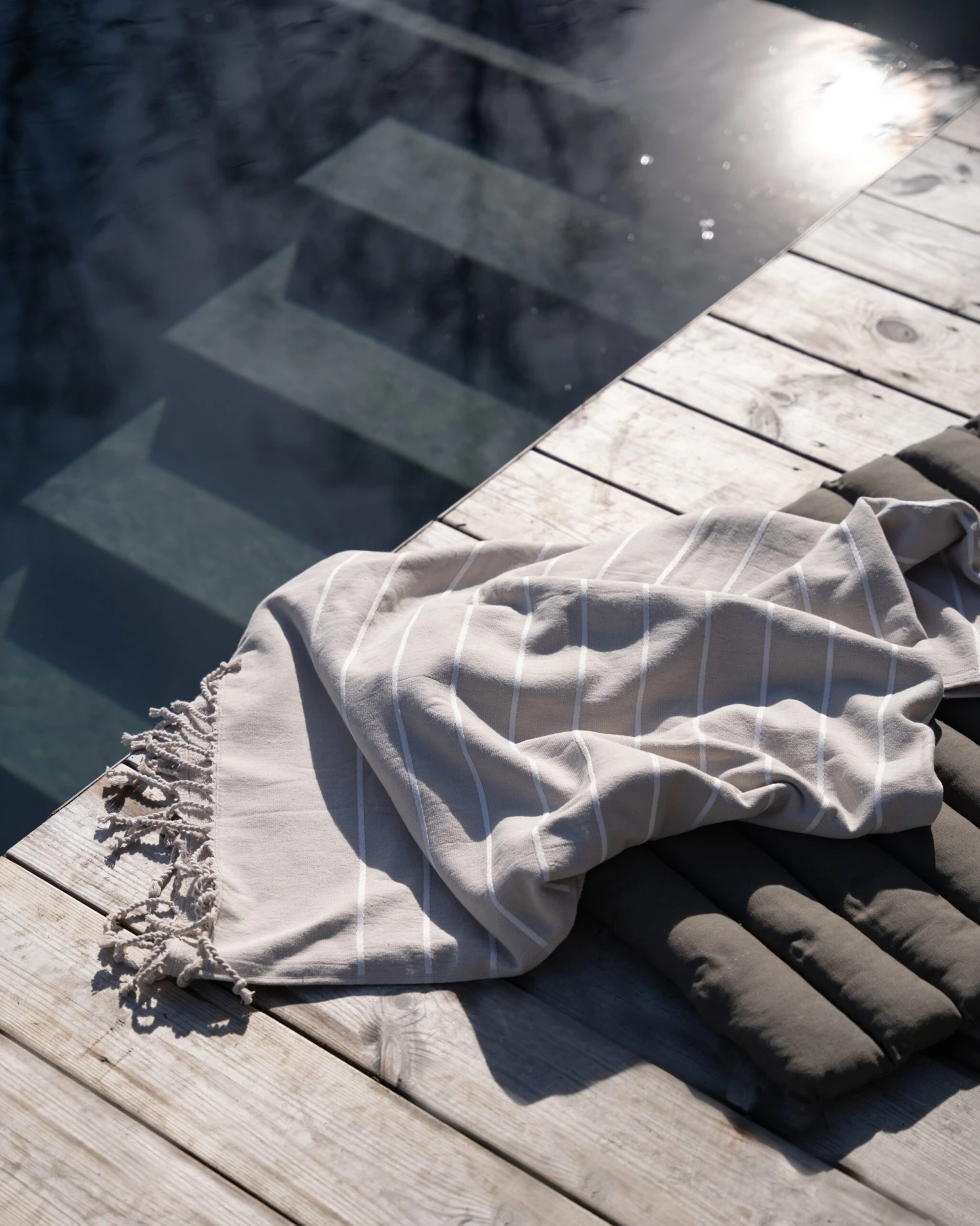 Ein kuscheliges Handtuch in Sand-Beige mit einer Frottee-Rückseite, die Wasser besonders gut aufnimmt, ideal für Picknick und Strand. Hergestellt aus 100% Baumwolle und Oeko-Tex-zertifiziert.