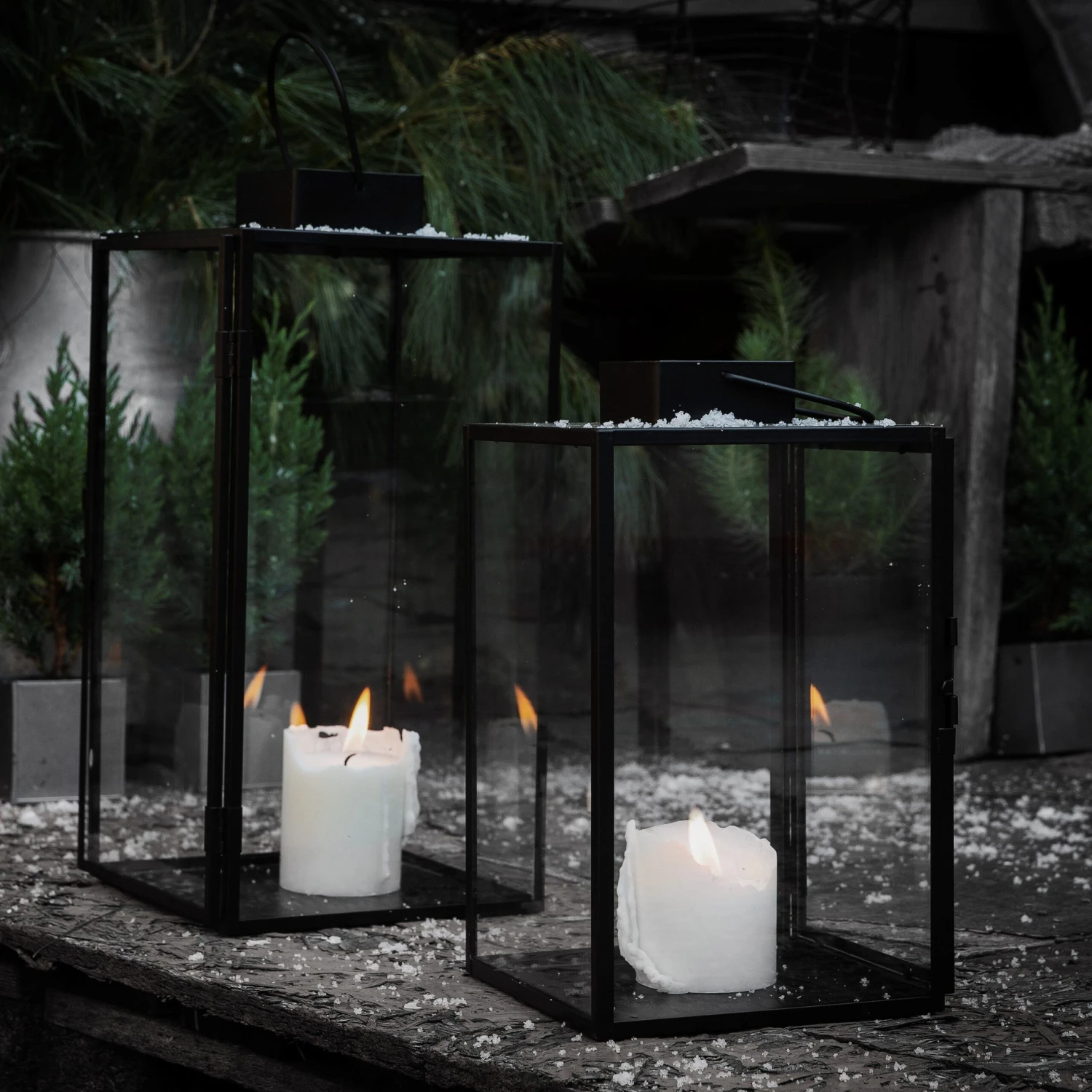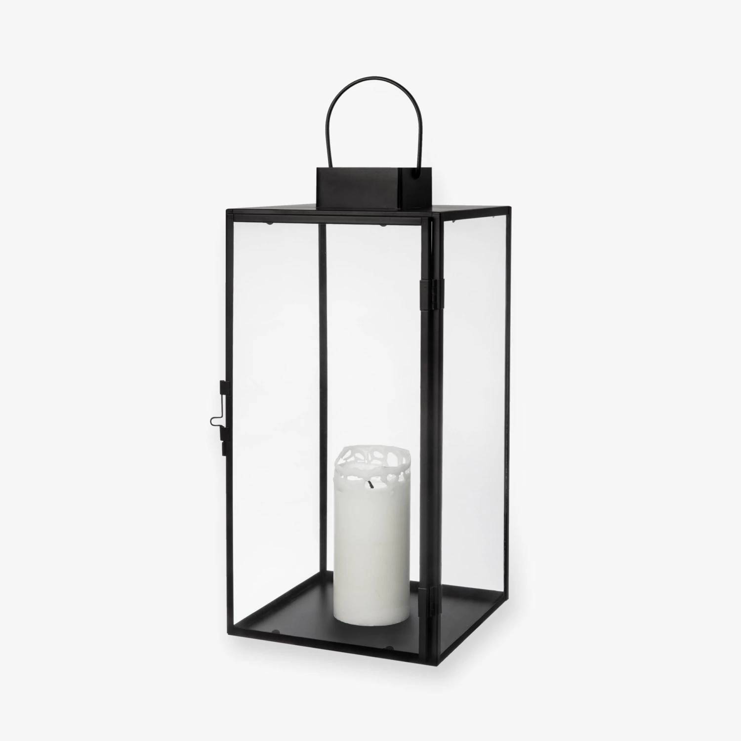 Schwarze Laterne aus Metall mit einer Glastür, die geöffnet und mit einem Häkchen geschlossen werden kann. Die Laterne ist wasserresistent und kann im Sommer/Herbst draußen stehen. Sollte nicht bei Minusgraden draußen stehen, da das Glas zerbrechen kann.