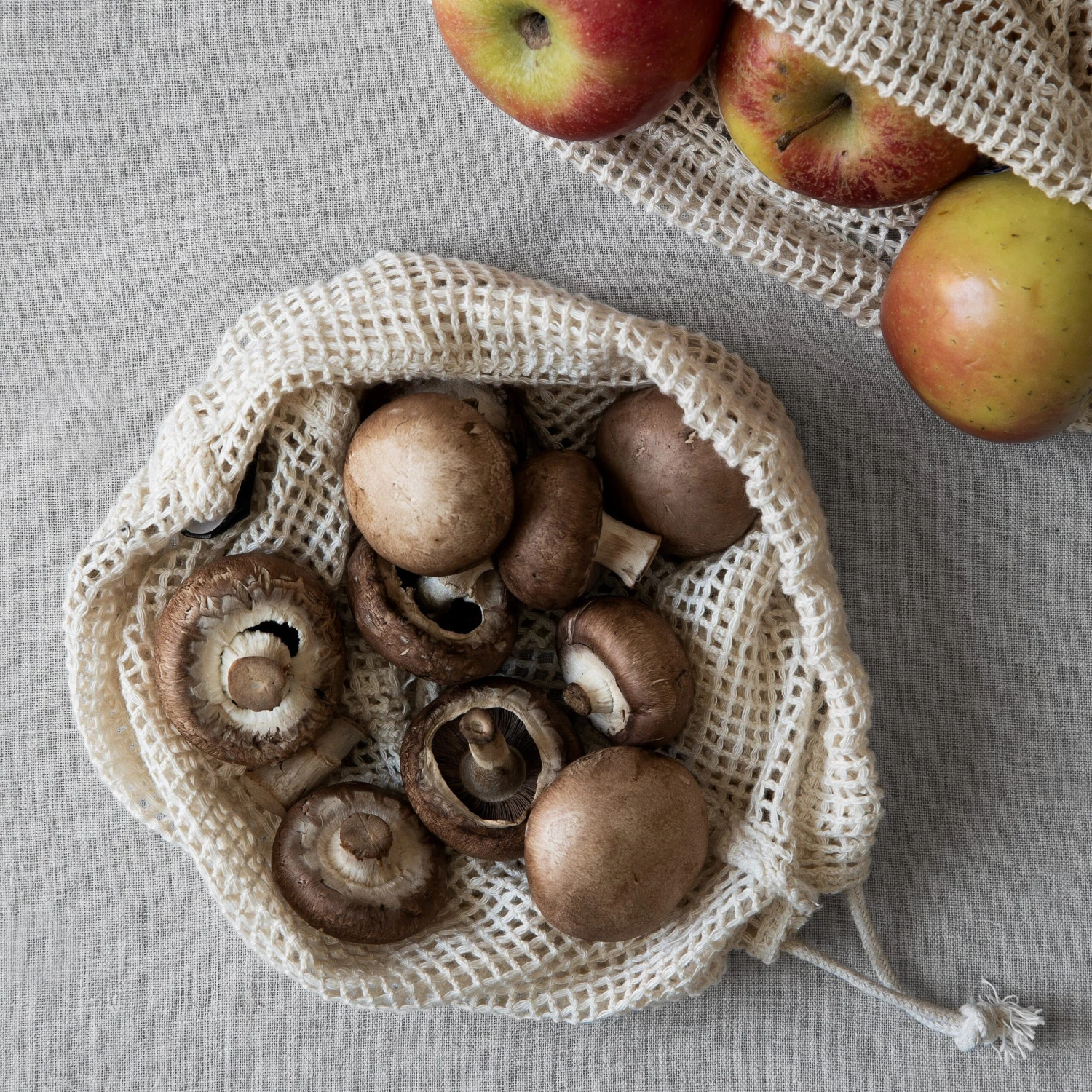 Netztasche mit Kordelzug aus 100 % biologisch angebauter Baumwolle.Eignet sich gut für den Einkauf von Obst und Gemüse und kann immer wieder verwendet werden.