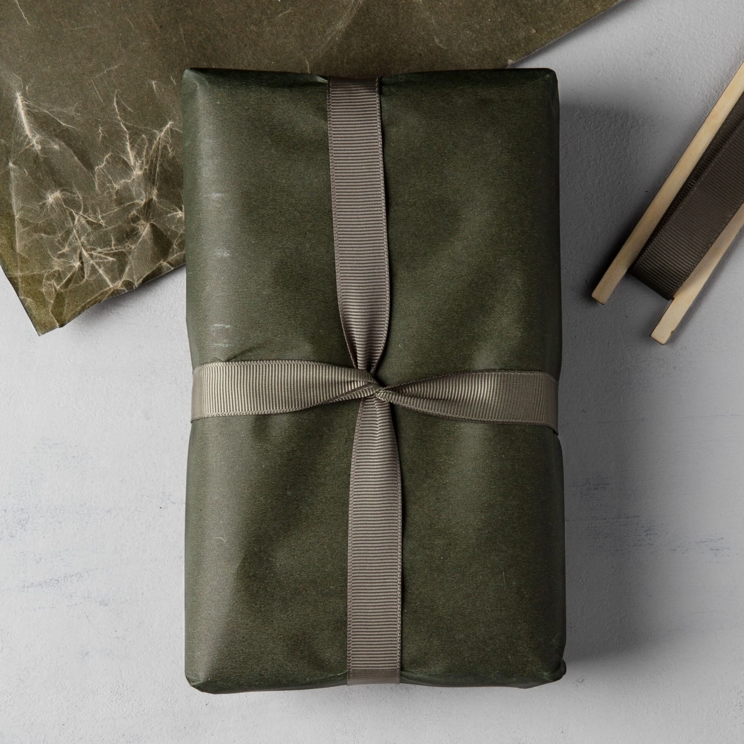 Gewachstes Geschenkpapier in einem schönen Grünton, das deinen Geschenken einen persönlichen und natürlichen Touch gibt. Die Breite der Rolle ist 70 cm, die Länge 5 m.