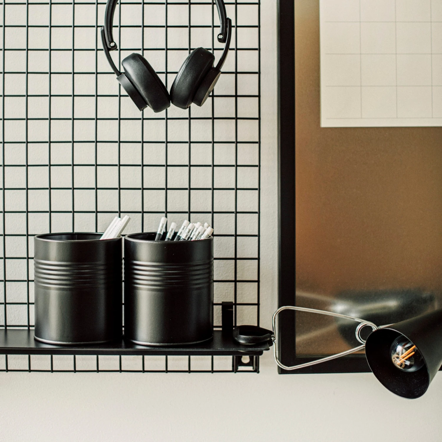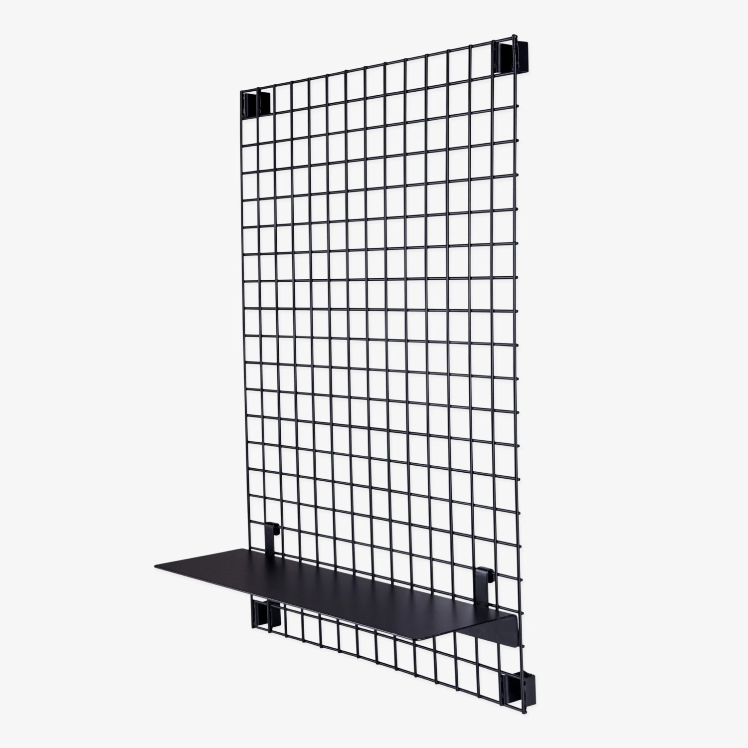 Smartes Regal aus schwarz lackiertem Metall zum Aufhängen an unseren beliebten Gitternetzen. Maße: L 42 B 12 H 6,6 cm.