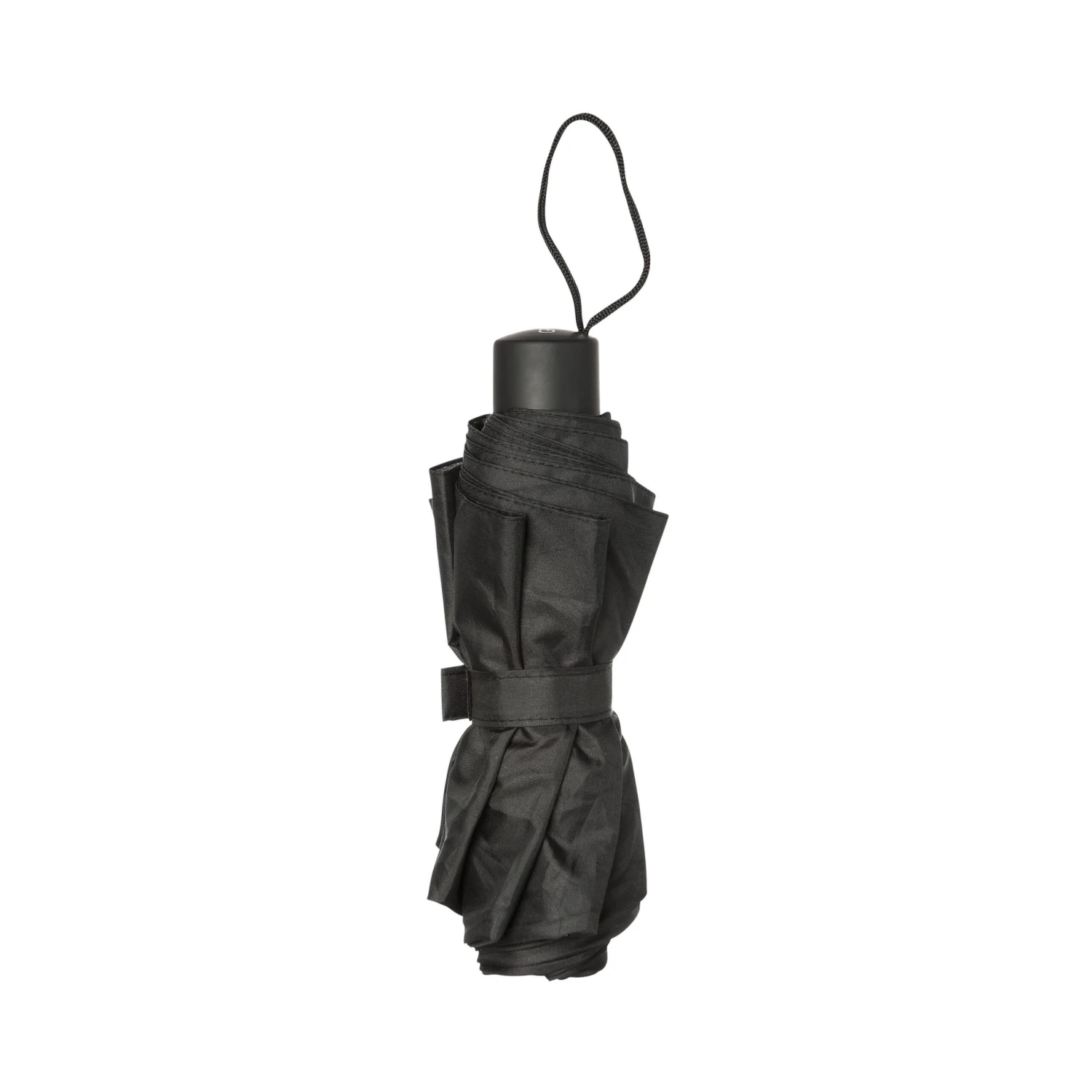 Zusammenklappbarer schwarzer Regenschirm, der bei Nichtgebrauch nur wenig Platz in der Tasche einnimmt. Wird mit einem Klettverschluss geschlossen und kann an einer Schlaufe am Griff aufgehängt werden.Maße geöffnet: H 55 Ø 99 cm. Maße zusammengeklappt: 6 x 6 x 24 cm.