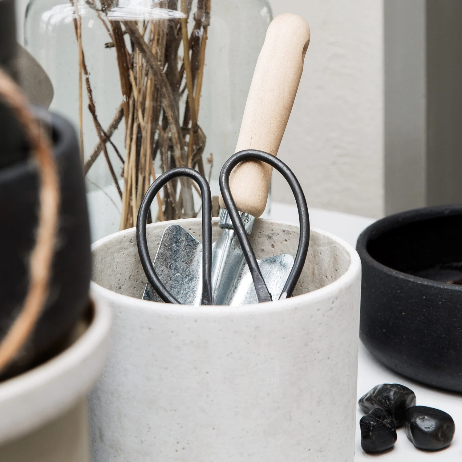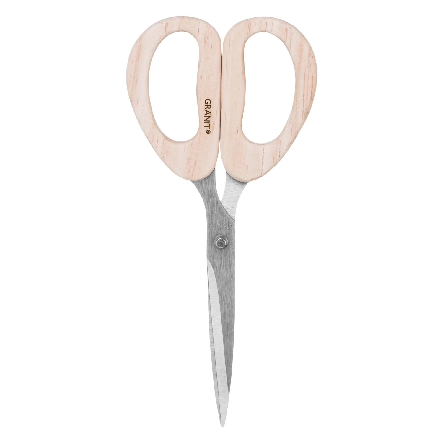 Praktische und schöne Schere mit Griffen aus unbehandeltem Kautschukholz.