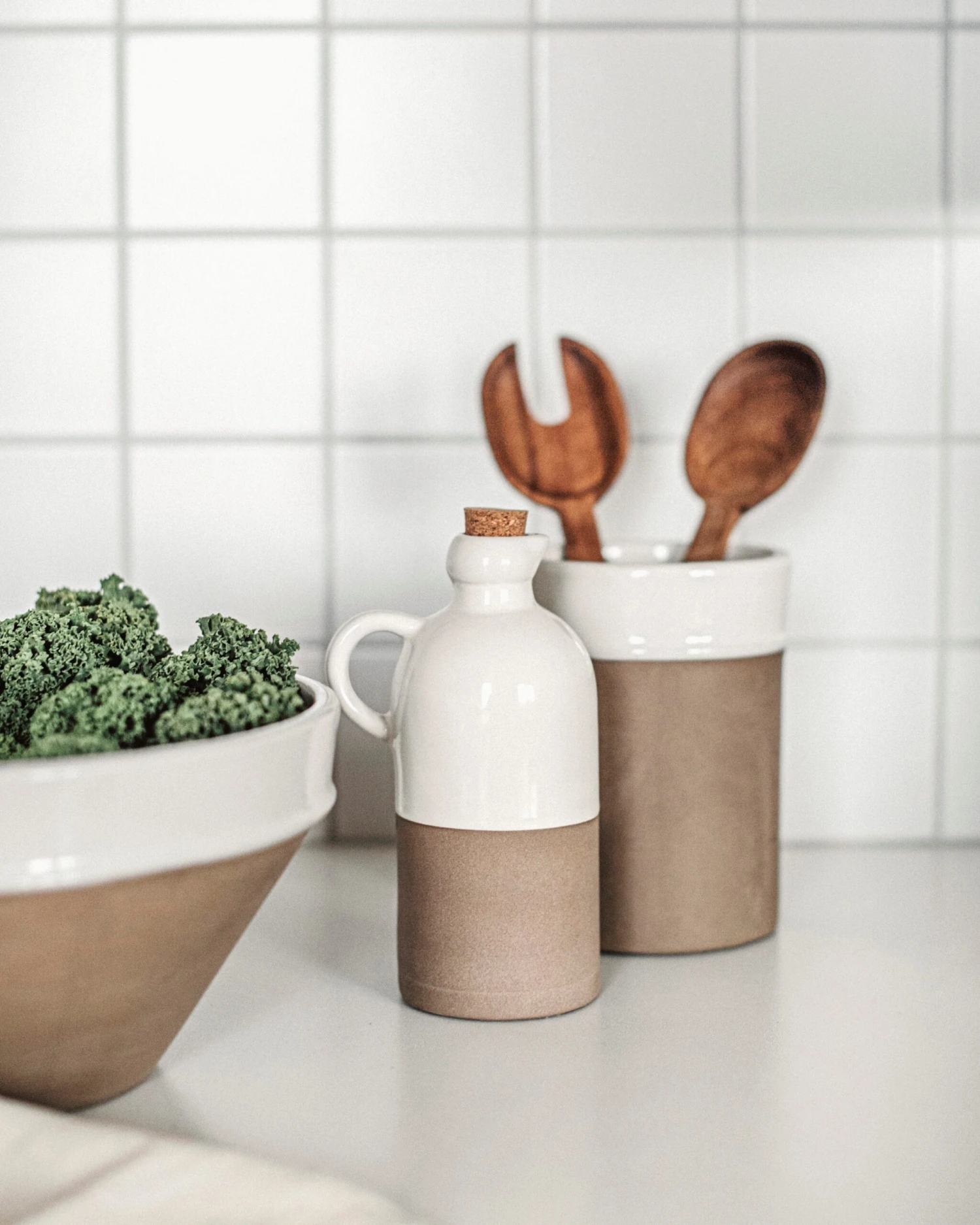 Stilvolle Servierschale aus teilweise glasiertem Natursteinzeug. In der gleichen Serie gibt es eine stilvolle Flasche für Öl/Essig und einen praktischen Halter für Utensilien.